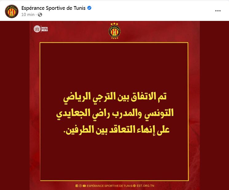 وكتب الترجي التونسي عبر الحساب الرسمي بموقع التواصل الاجتماعي “فيس بوك”: “تم الاتفاق بين الترجي التونسي وراضي الجعايدي على انهاء التعاقد بين الطرفين”.
