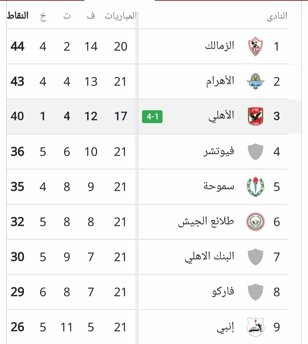 ويحتل الفريق الأول لكرة القدم بالنادي الأهلي المركز الثالث في جدول ترتيب مسابقة الدوري المصري برصيد 40 نقطة، من 17 مباراة.