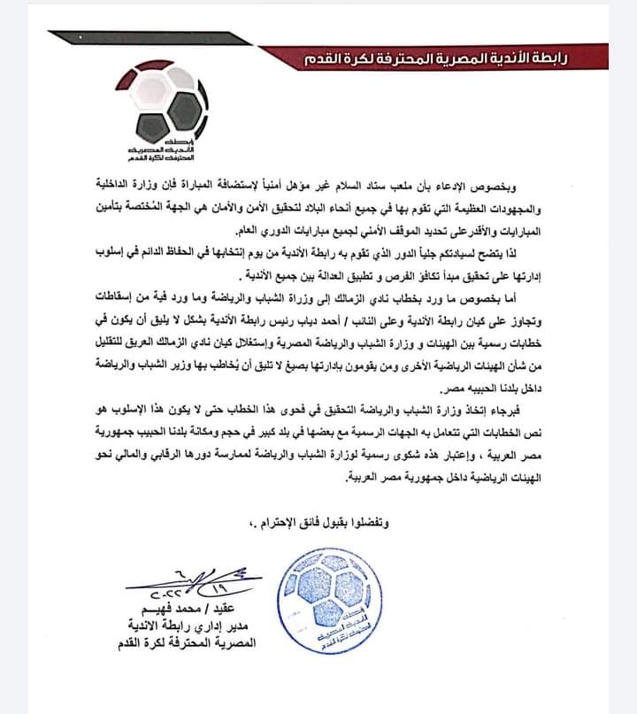 وأرسلت رابطة الأندية، خطابًا رسميًا إلى وزارة الشباب والرياضة، أكدت خلاله أنه لابد من اتخاذ إجراء وتحقيق بشأن “أسلوب” وتجاوزات خطاب نادي الزمالك أمس.
