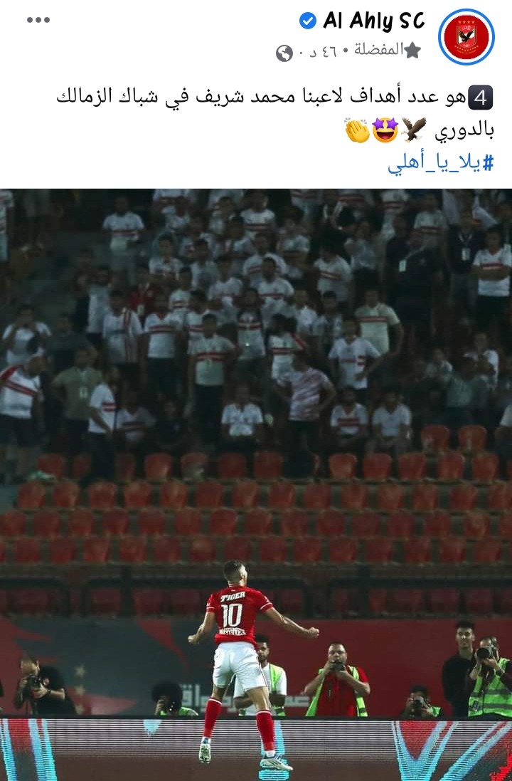 وكتب النادي الأهلي عبر حسابه الرسمي على موقع التواصل الاجتماعي فيس بوك: “4️⃣هو عدد أهداف لاعبنا محمد شريف في شباك الزمالك بالدوري”.