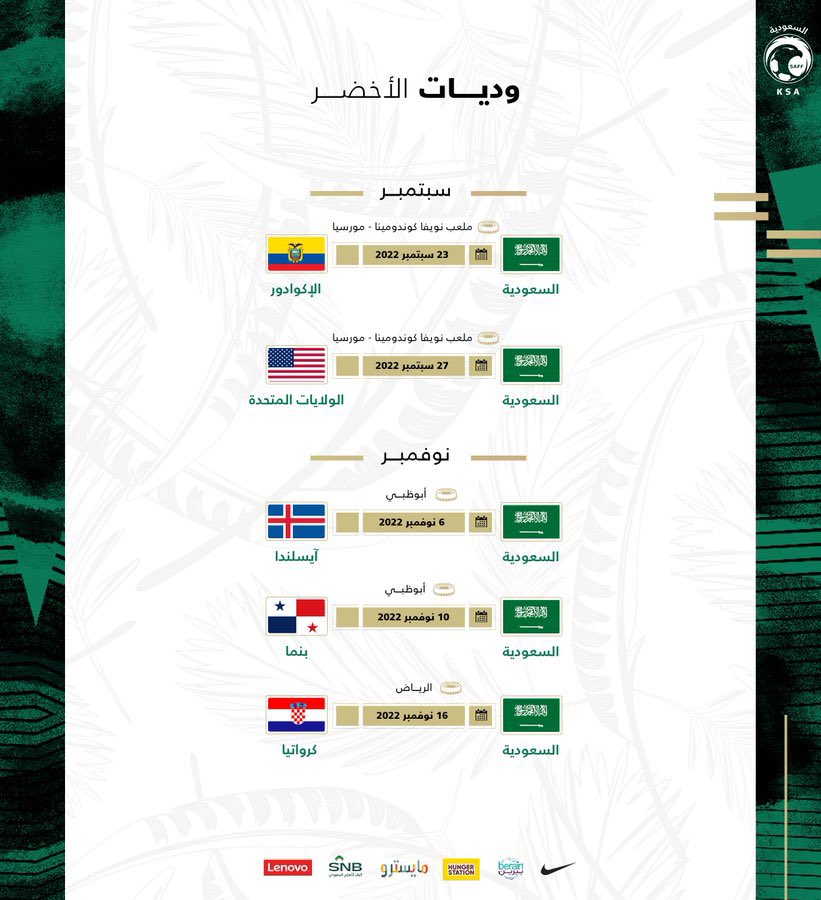 يخوض المنتخب السعودي الأول لكرة القدم، 5 وديات، استعدادًا لخوض منافسات كأس العالم قطر 2022.