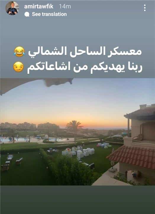 ونشر أمير توفيق صورة عبر يومياته على موقع “تويتر” لإحدى المنتجعات السياحية: “معسكر الساحل الشمالي”.