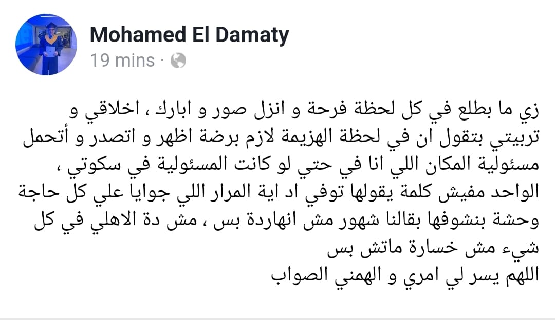 وكتب الدماطي عبر حسابه الرسمي بموقع التواصل الاجتماعي “فيسبوك” قائلاً: “زي ما بطلع في كل لحظة فرحة وأنزل صور وأبارك، أخلاقي وتربيتي بتقول إن في لحظة الهزيمة لازم برضة أظهر وأتصدر وأتحمل مسؤولية المكان اللي أنا فيه حتي لو كانت المسؤولية في سكوتي”.
