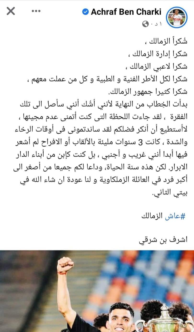 ودع المغربي أشرف بن شرقي، لاعب الفريق الأول لكرة القدم بنادي الزمالك، الجماهير البيضاء، برسالة مؤثرة، بعد قرار رحيله عن الفريق.