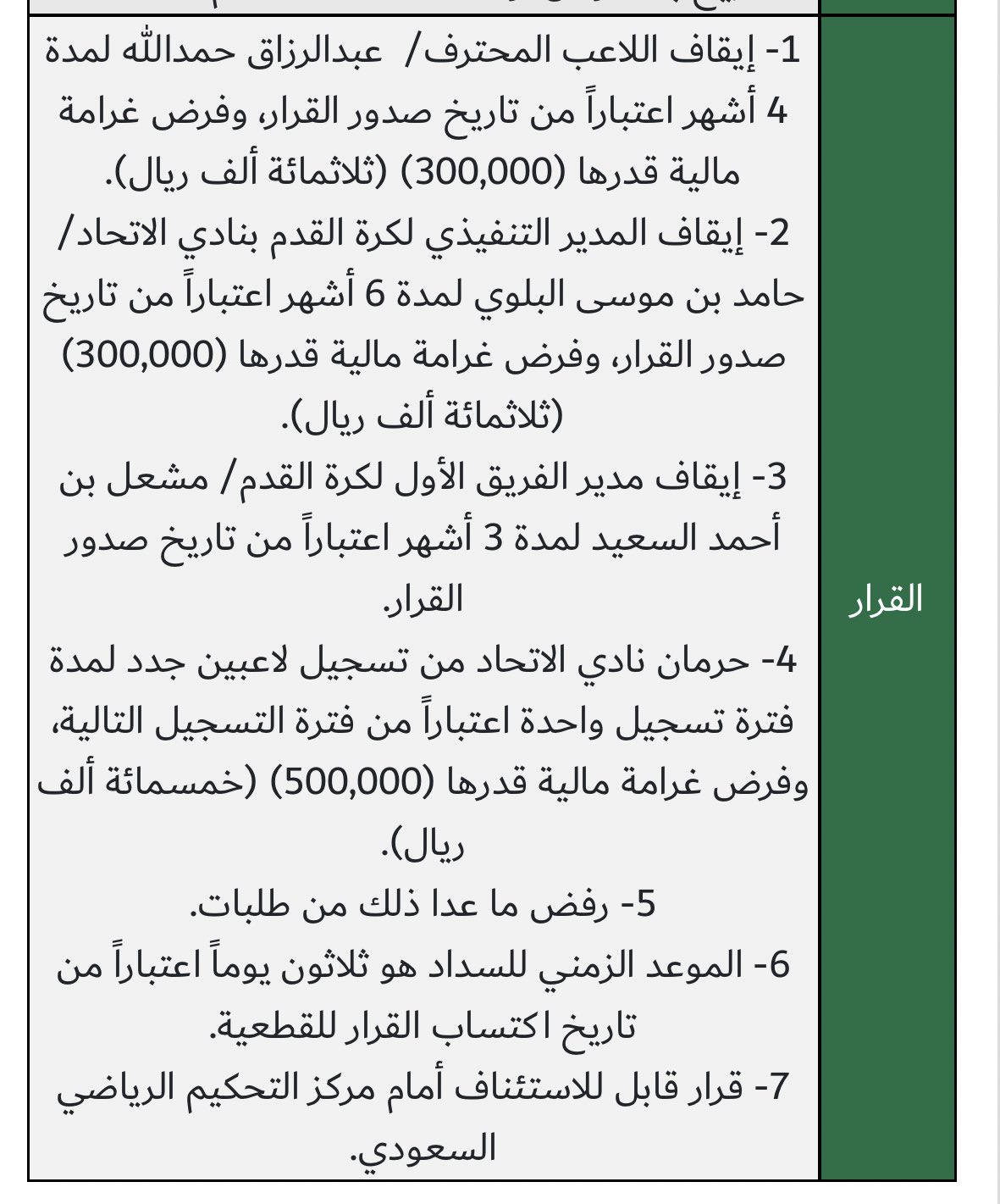2- إيقاف المدير التنفيذي لنادي اتحاد جدة، حامد بن موسى البلوي، لمدة6 أشهر، وغرامة 300 ألف ريال سعودي.