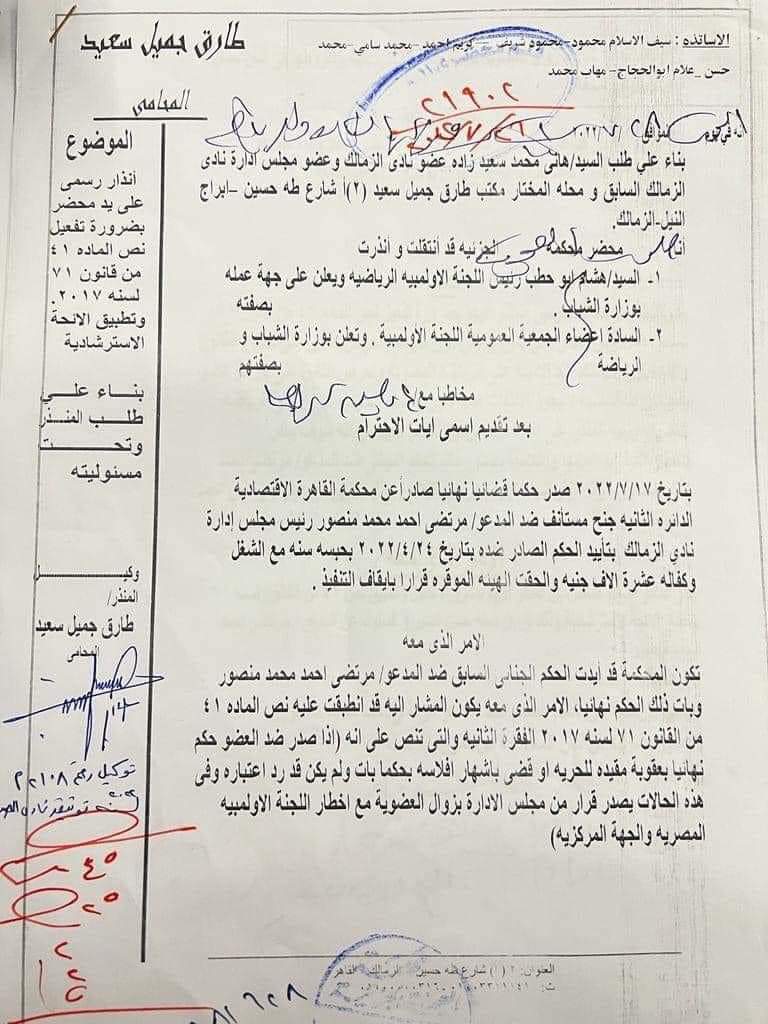 وتابع: “تم إنذار اللجنة الأولمبية ووزير الرياضة (الجهة الإدارية) من خلال إنذارات قضائية بضرورة تفعيل القانون، مصر دولة قانون.