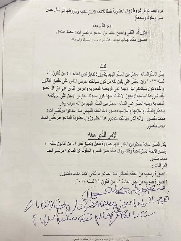 وواصل:” ففي هذه الحالات يصدر قرار من مجلس الإدارة بزوال العضوية مع إخطار اللجنة الأولمبية المصرية والجهة الإدارية”.