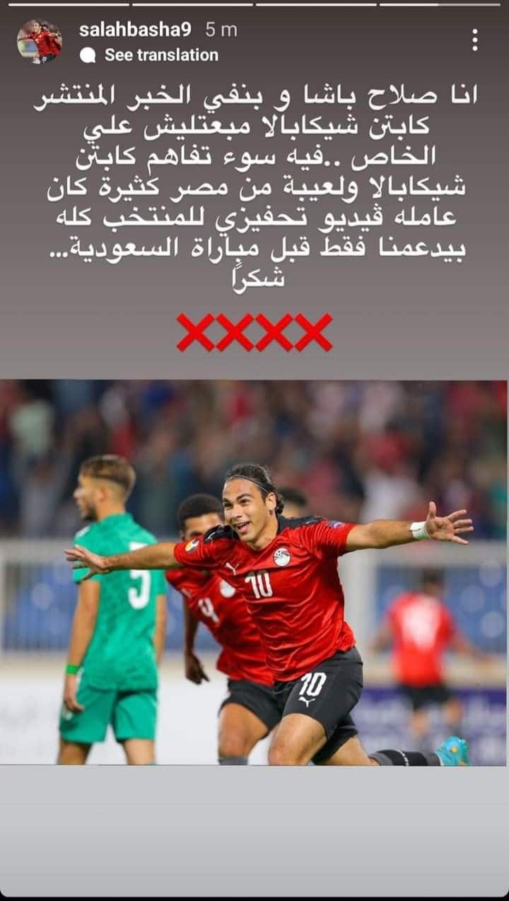 وكتب صلاح الدين باشا عبر حسابه الرسمي على موقع التواصل الاجتماعي “انستجرام”: “أنا صلاح باشا وبنفي الخبر المنتشر.. كابتن شيكابالا مبعتليش على الخاص، فيه سوء تفاهم كابتن شيكابالا ولعيبة من مصر كثيرة كانت عاملة فيديو تحفيزي للمنتخب كله بيدعمنا فقط قبل مباراة السعودية شكرا”.
