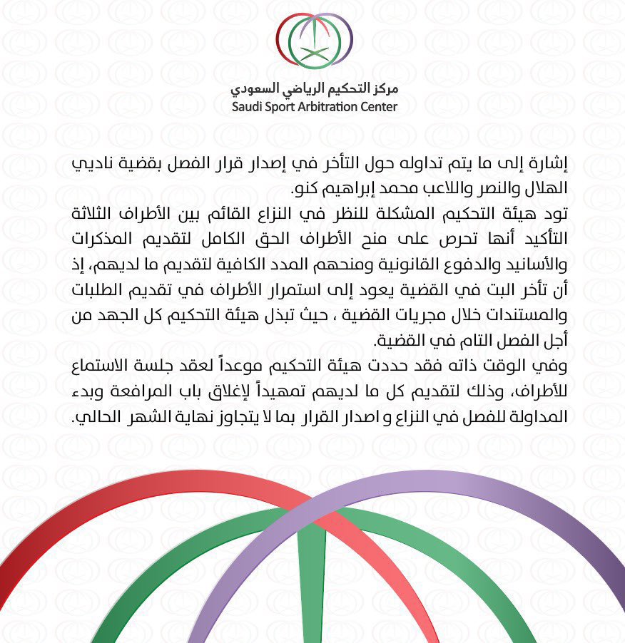 وأعلن مركز التحكيم الرياضي في بيان رسمي، اليوم الجمعة، أنه سيتم إصدار قرار قضية لاعب الهلال محمد كنو، قبل نهاية الشهر الحالي.