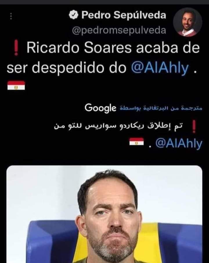 أكد الصحفي البرتغالي بيدرو سيبولفيدا، عن إقالة المدير الفني للنادي الأهلي، البرتغالي ريكاردو سواريش، حيث كتب على صفحته الرسمية على موقع التواصل الإجتماعي ” تويتر”: ” تم إقالة ريكاردو سواريس للتو من النادي الأهلي.”