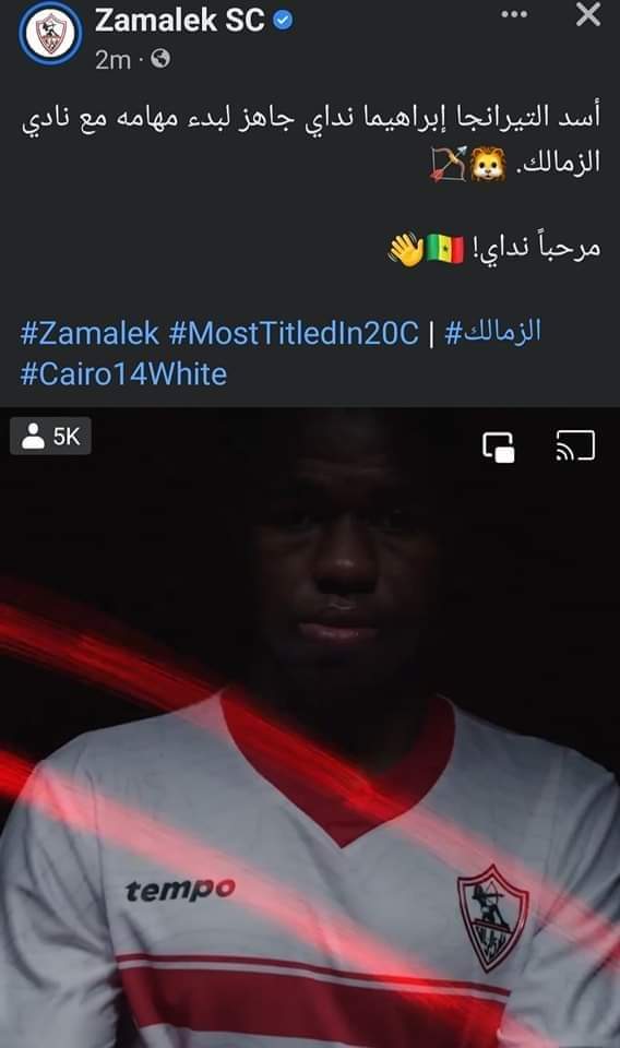 كشف النادي عن التعاقد مع اللاعب الجديد بجملة “أسد التيرانجا إبراهيما نداي جاهز لبدء مهامه مع نادي الزمالك”.