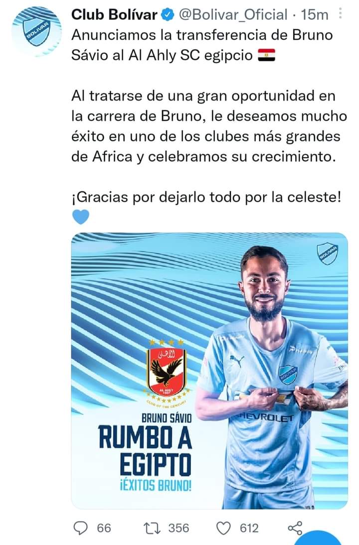 و كان النادي البوليفي قد أعلن انتقال النجم البرازيلي رسميا” إلى صفوف النادي الأهلي في صفقة بلغت قيمتها حوالي ١,٥ مليون يورو.