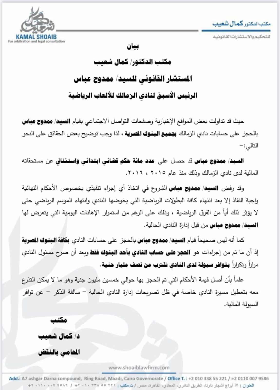 وشدد على عدم صحة قيام ممدوح عباس رئيس الزمالك الأسبق بالحجز على حسابات النادي بكافة البنوك المصرية، موضحًا أن ما تم من إجراءات هو الحجز على حساب بأحد البنوك فقط، وذلك بعد أن صرح مسؤول القلعة البيضاء مرارًا وتكرارًا بتوافر سيولة لدى النادي تقترب من نصف مليار جنيه.