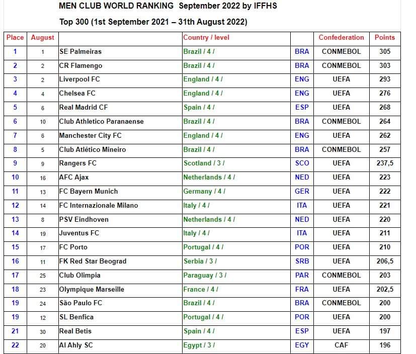 أعلن الاتحاد الدولى للتاريخ والإحصاء “IFFHS”، اليوم الاثنين عن التصنيف العربي والقاري والعالمي للأندية عن شهر سبتمبر.