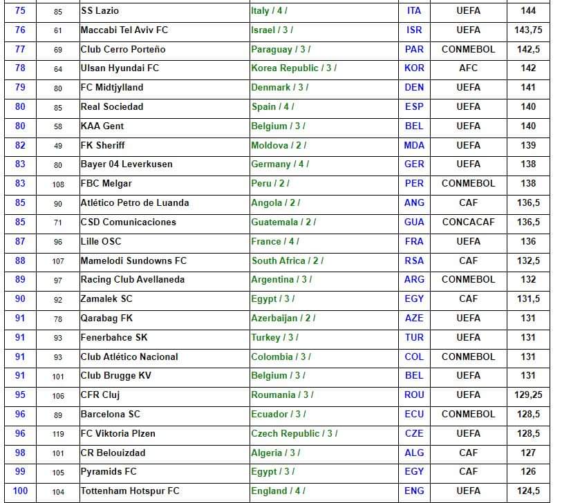 فيما تقدم الزمالك مركزين في المركز 90 في القائمة برصيد 131.5 نقطة، حيث كان احتل المركز 92 في الشهر الماضي.