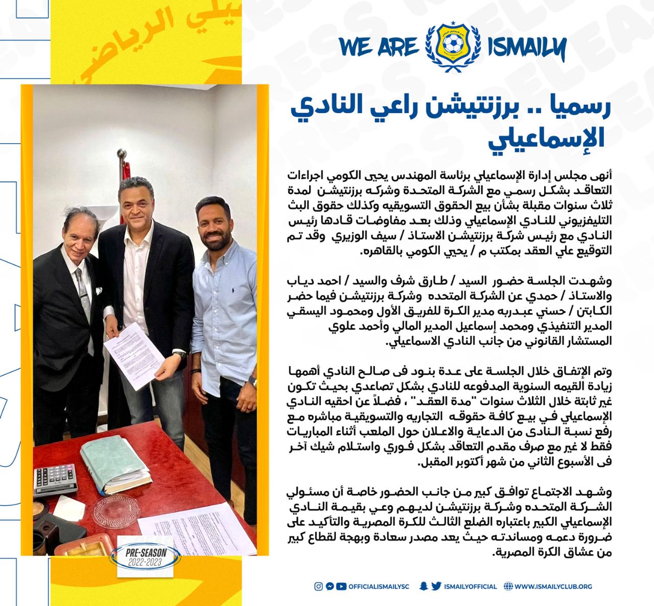 وأصدر النادي الإسماعيلي بيانًا غبر حسابه الرسمي بموقع التواصل الاجتماعي “تويتر” يوضح خلاله تفاصيل التعاقد مع بريزنتيشن والشركة المتحدة.