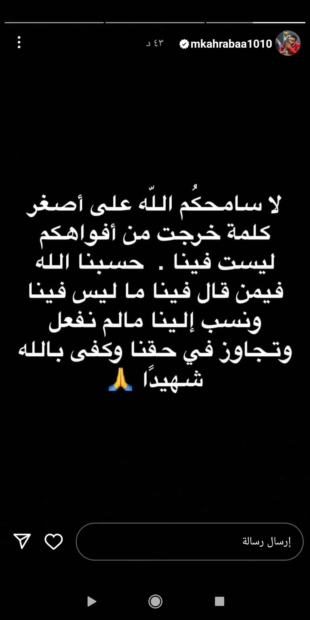وكتب كهربا عبر «ستوري انستجرام»: “«لا سامحكم الله على أصغر كلمة خرجت من أفواهكم ليست فينا، حسبنا الله فيمن قال فينا ما ليس فينا، ونسب إلينا ما لم نفعل وتجاوز في حقنا وكفى بالله شهيدًا».