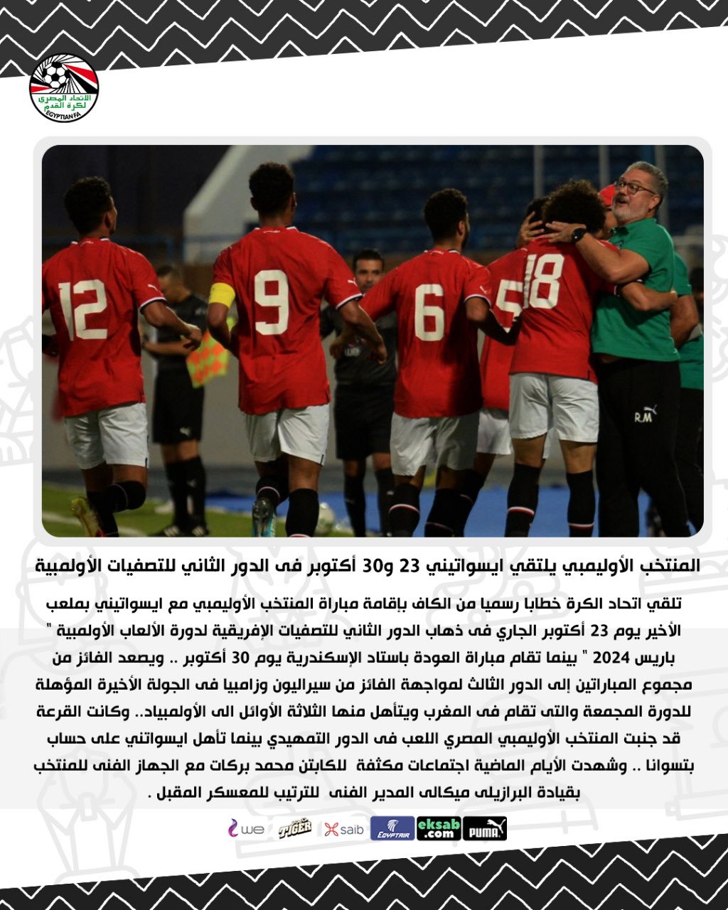 أعلن الاتحاد المصري لكرة القدم موعد مباراتي منتخب مصر الأولمبي أمام نظيره إيسواتيني في تصفيات أمم افريقيا تحت 23 عامًا، والمؤهلة إلى دورة الألعاب الأولمبية باريس 2024.