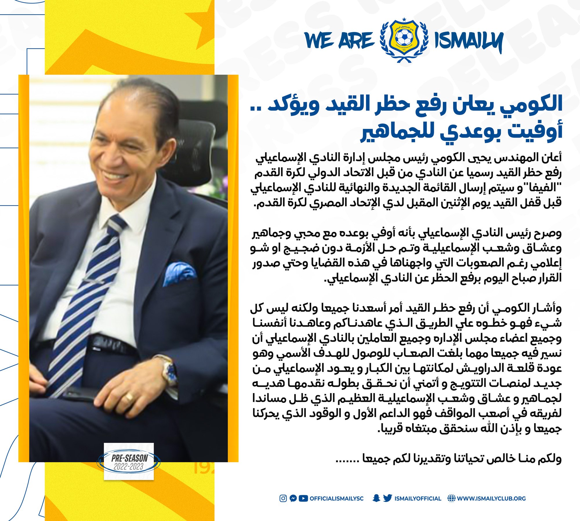 أعلن مجلس إدارة النادي الإسماعيلي برئاسة يحيى الكومي رفع حظر القيد عن الدراويش رسميًا اليوم الجمعة من قبل الاتحاد الدولي لكرة القدم “فيفا”.