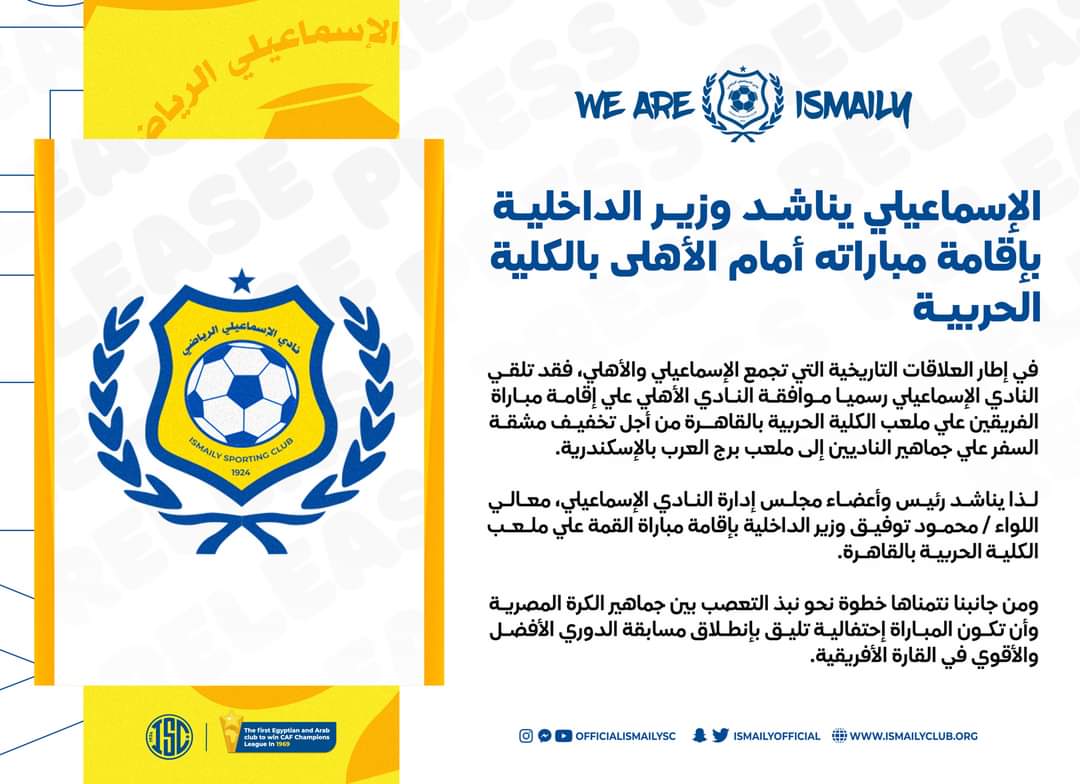 في بيان رسمي..الإسماعيلي يناشد وزارة الداخلية بخصوص مباراة الأهلي