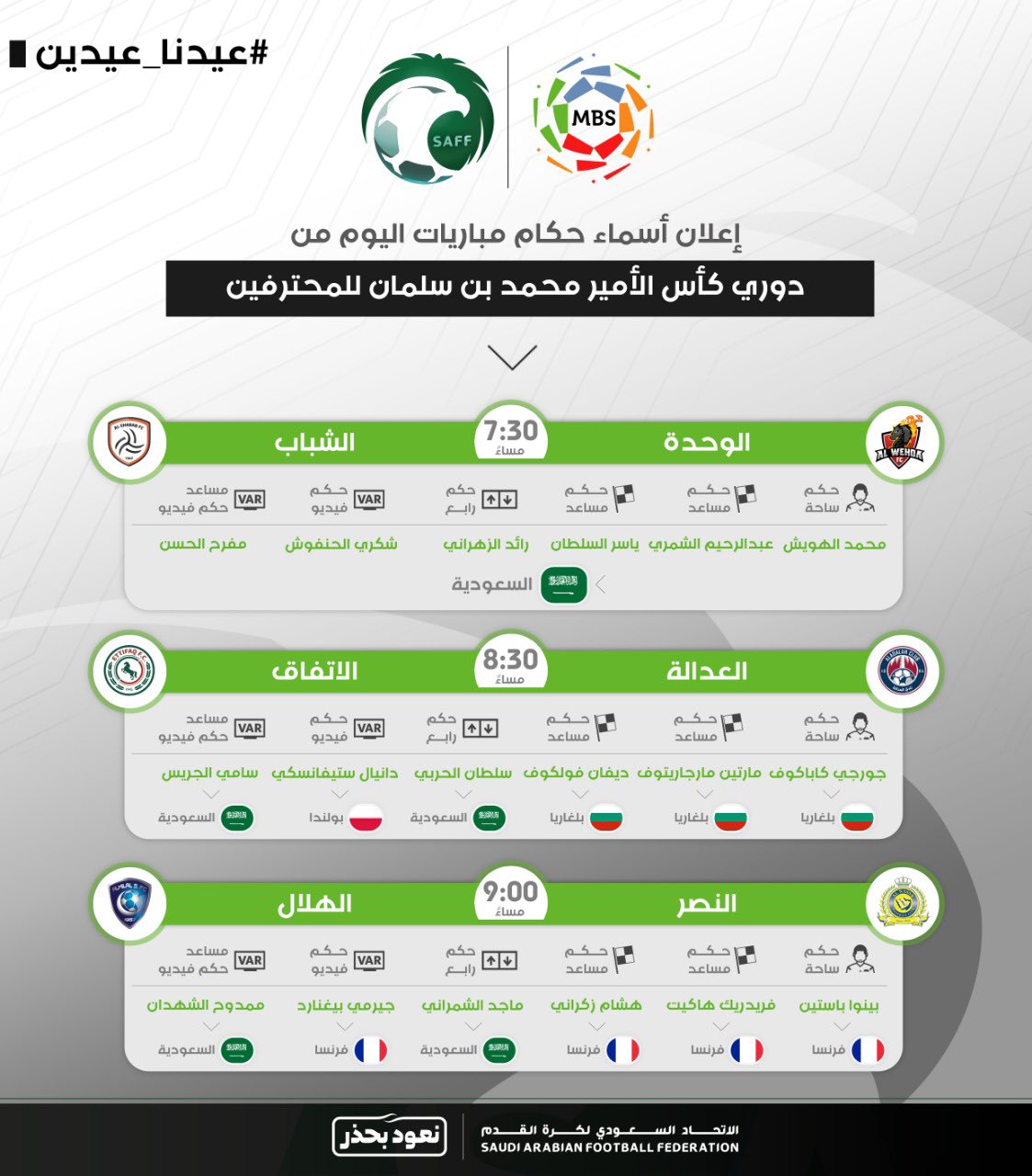 فيما جاء باقي حكام مباريات اليوم كالتالي: