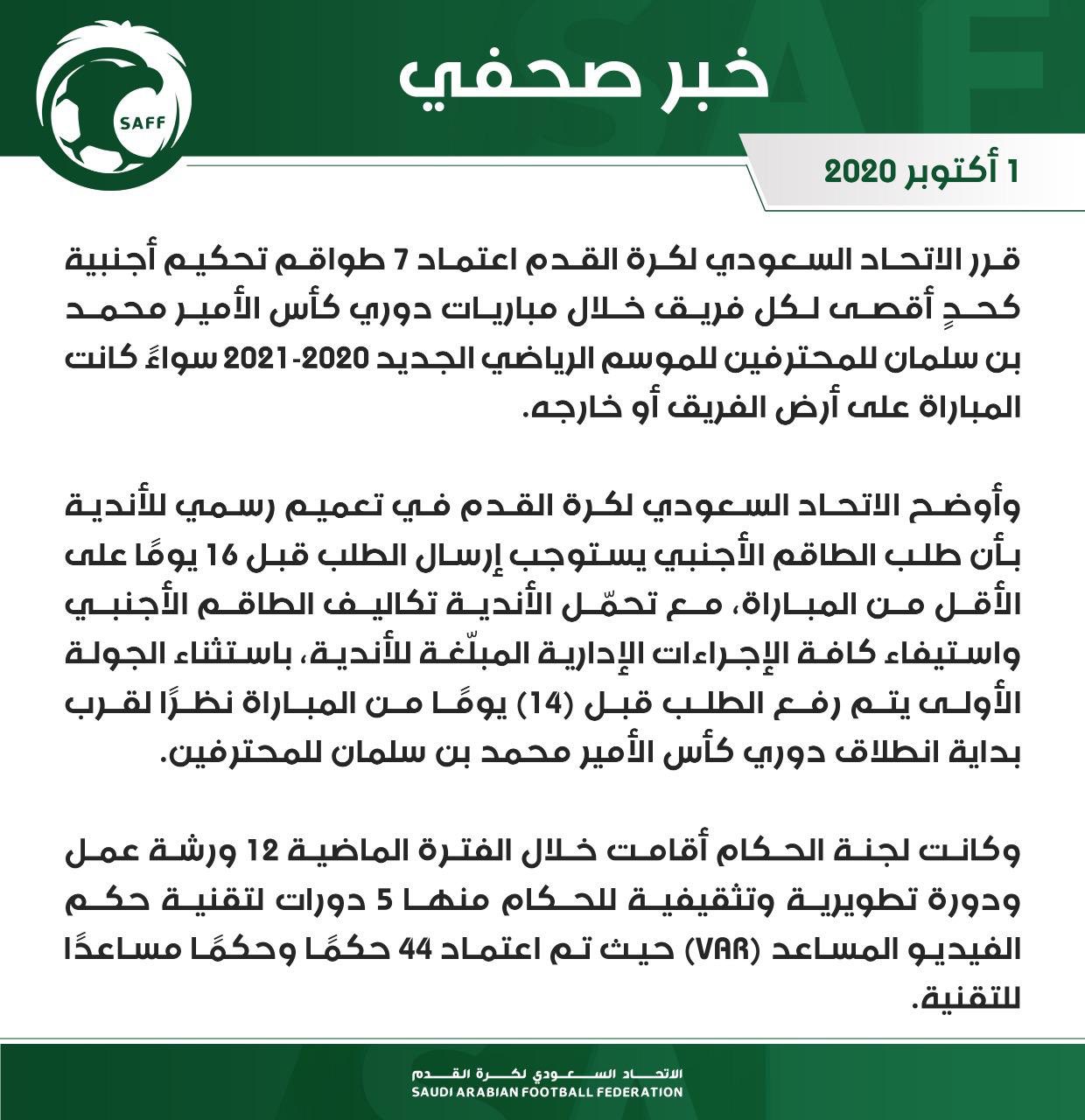 وأصدر الاتحاد السعودي بيانًا رسميًا أوضح خلاله أن الأندية ستقوم بالتقدم بطلب رسمي قبل استقدام الحكام الأجانب ب16 يومًا، بينما الجولة الأولى سيكون الطلب قبل المباراة ب14 يومًا،باستثناء الجولة بالاضافة إلى التحمل الكامل للتكاليف واستيفاء كافة الإجراءات الإدارية.