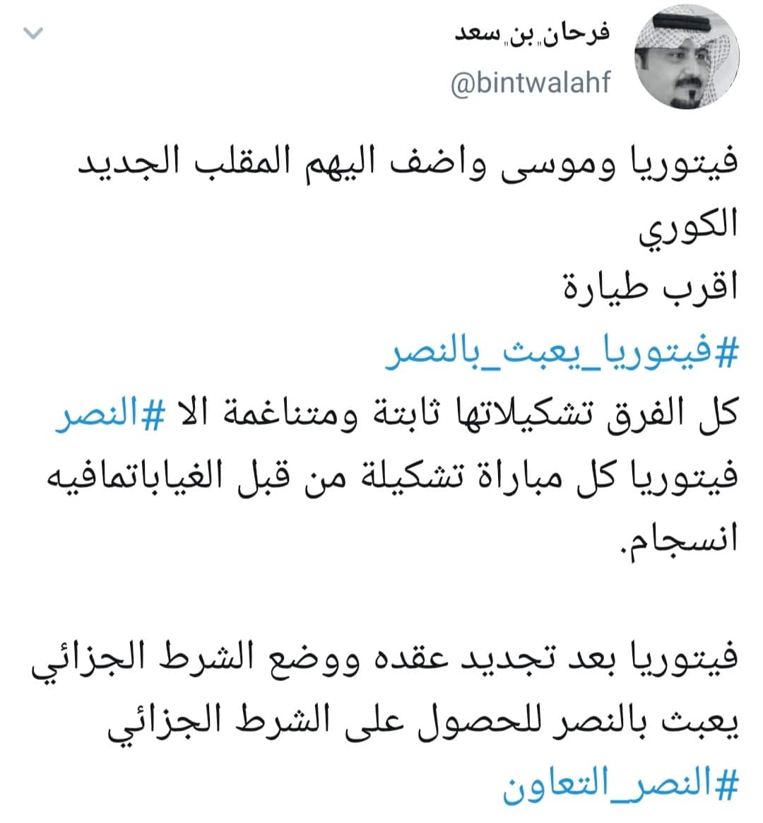 يدرس مجلس إدارة النصر السعودي برئاسة صفوان السكويت الإطاحة بالبرتغالي روي فيتوريا المدير الفني للفريق الكروي الأول، عقب سوء النتائج والبداية الغير مبشرة في مشوار دوري كأس الأمير محمد بن سلمان للمحترفين.