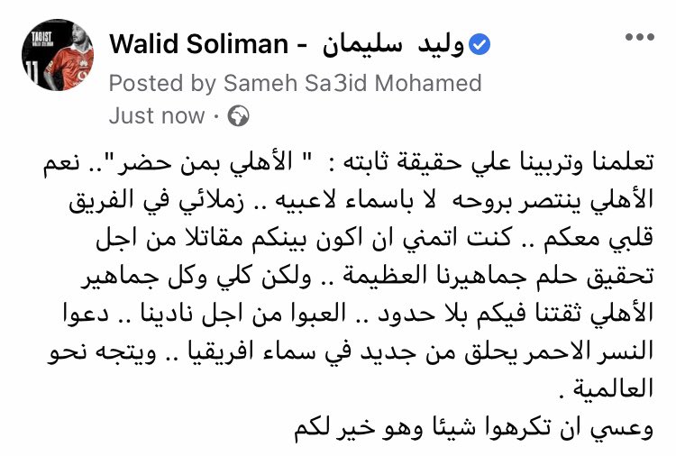 وقال وليد سليمان عبر حسابه الرسمي بموقع التواصل الاجتماعي “تويتر”: “الأهلي بمن حضر” هذه حقيقة ثابتة تربينا عليها في القلعة الحمراء، فالاحمر ينتصر بروحه لا باسماء لاعبيه”.