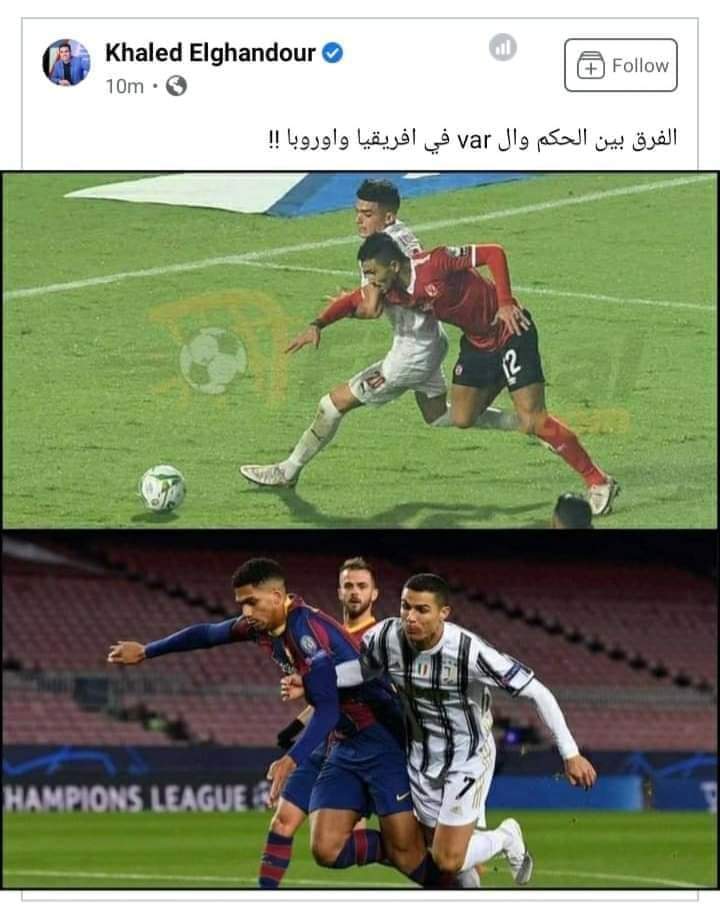 وعلق خالد الغندور على الصورة التي نشرها عبر حسابه على موقع “فيسبوك” قائلاً: “الفرق بين الحكم والفار في أفريقيا وأوروبا”، في إشارة إلى استحقاق نجم الزمالك للحصول على ركلة جزاء مثل كريستيانو رونالدو.