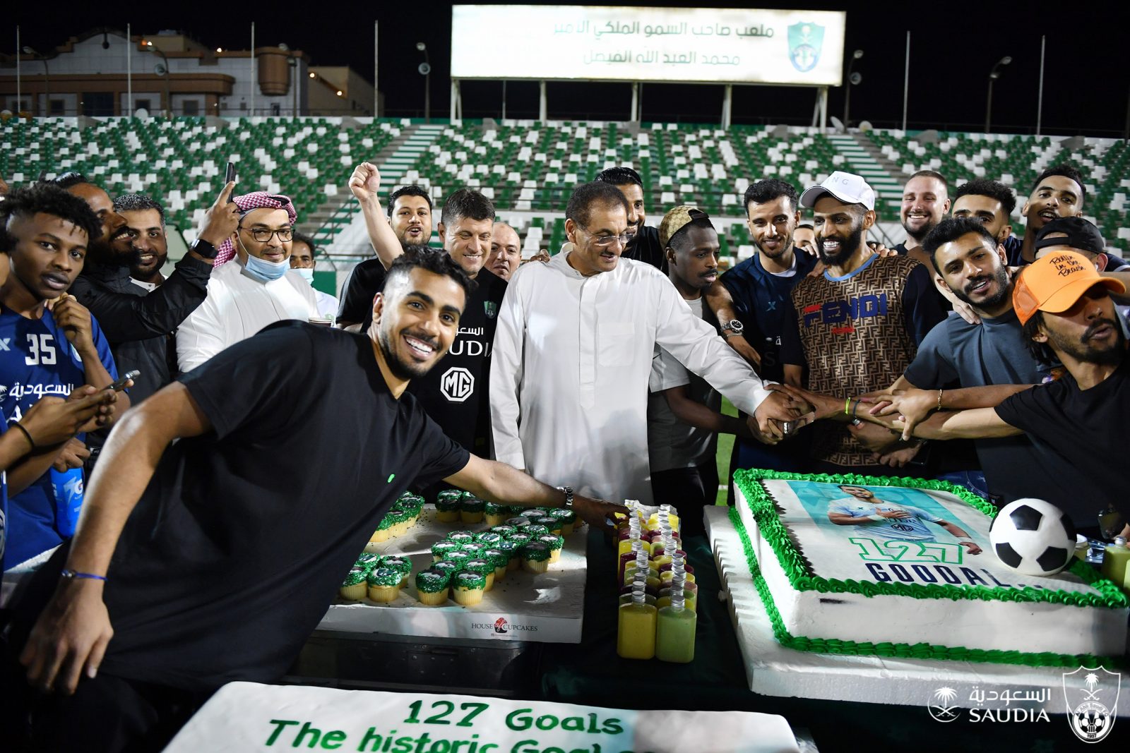 وتواجد الجهازين الفني والإداري واللاعبين خلال احتفال اليوم بالنجم السوري، والذي وصل إلى الرقم 127 هدف ليصبح الهداف التاريخي للدوري السعودي للمحترفين، ليتخطى رقم ناصر الشمراني الذي أحرز 126 هدف.