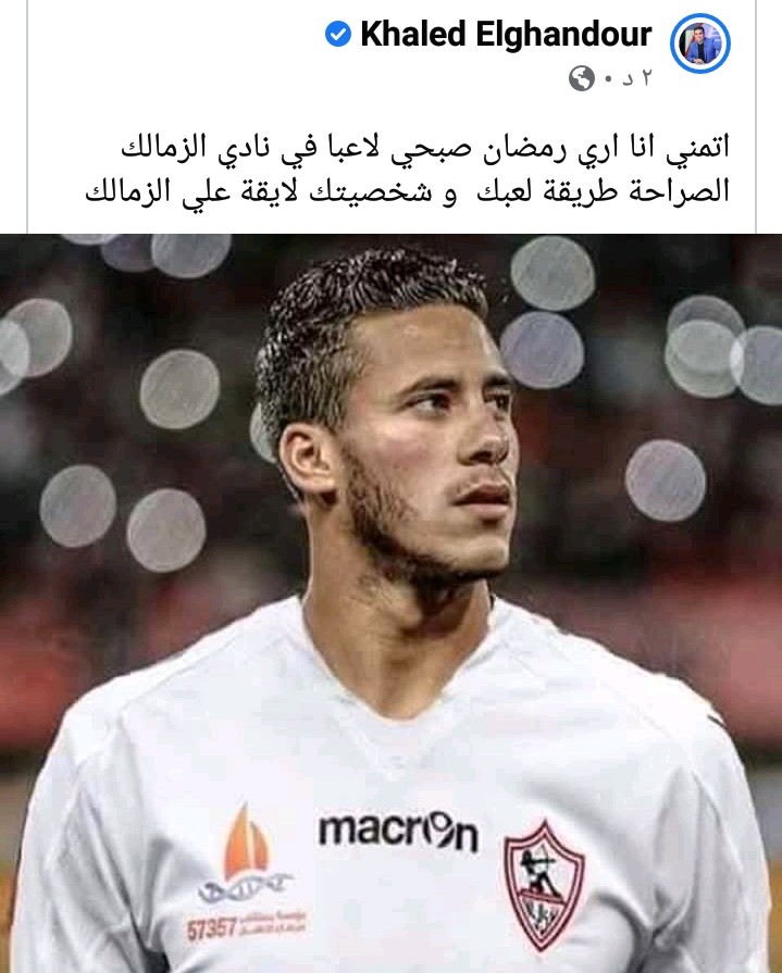 ونشر خالد الغندور صورة للاعب الأهلي السابق رمضان صبحي، عبر حسابه الشخصي على موقع التواصل الاجتماعي فيسبوك، وهو مرتديا قميص الزمالك.