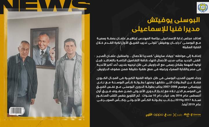 وكشف الإسماعيلي أنه تم تعيين المدير الفني البوسني دراجان يوفيتش، مدربا للفريق الأول لكرة القدم بالنادي.