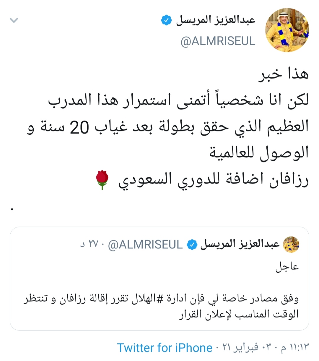 وغرد المريسل عبر حسابه الرسمي بموقع التواصل الاجتماعي “تويتر”: “وفق مصادر خاصة لي فإن إدارة الهلال تقرر إقالة الروماني رزافان لو شيسكو وتنتظر الوقت المناسب لإعلان القرار”.