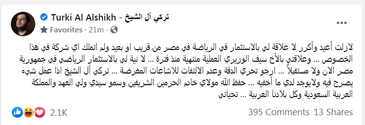 وكتب “آل الشيخ” عبر حسابه الرسمي على موقع التواصل الاجتماعي “فيسبوك”: “لازلت أعيد وأكرر لا علاقة لي بالاستثمار في الرياضة في مصر من قريب أو بعيد ولم أتملك أي شركة في هذا الخصوص، وعلاقتي بالأخ سيف الوزيري العملية منتهية منذ فترة”.