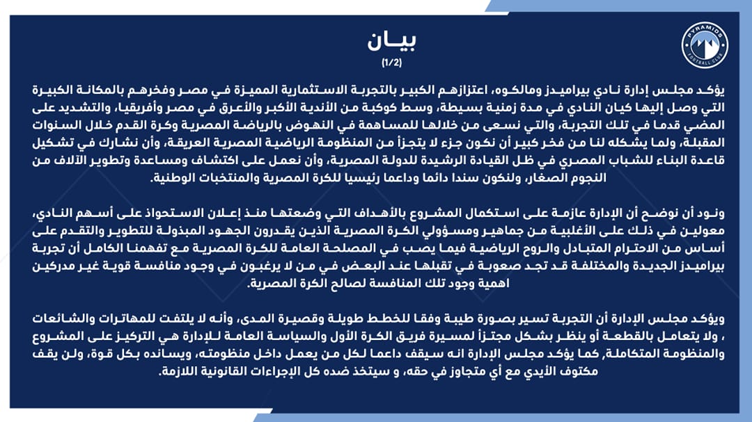 وأكد نادي بيراميدز خلال بيانه برئاسة سالم الشامسي، أنه سيستكمل المسيرة في الدوري المصري، مشيرا إلى أنه سيتصدى بكل حزم للتجاوز ضد النادي، موضحا أن الجميع في بيراميدز يعلم أن التجربة تنال اعجاب البعض من الجماهير المصرية، إلا أن البعض الآخر لا يتقبلها.