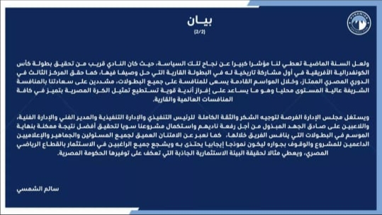 وأشار بيراميدز في بيانه إلى أن يهدف إلى تحقيق المزيد من الإنجازات خلال الفترة المقبلة، وذلك بمساندة جماهير ومسئولي الكرة المصرية، بعدما حصد المركز الثاني في الكونفدرالية الإفريقية الموسم الماضي.