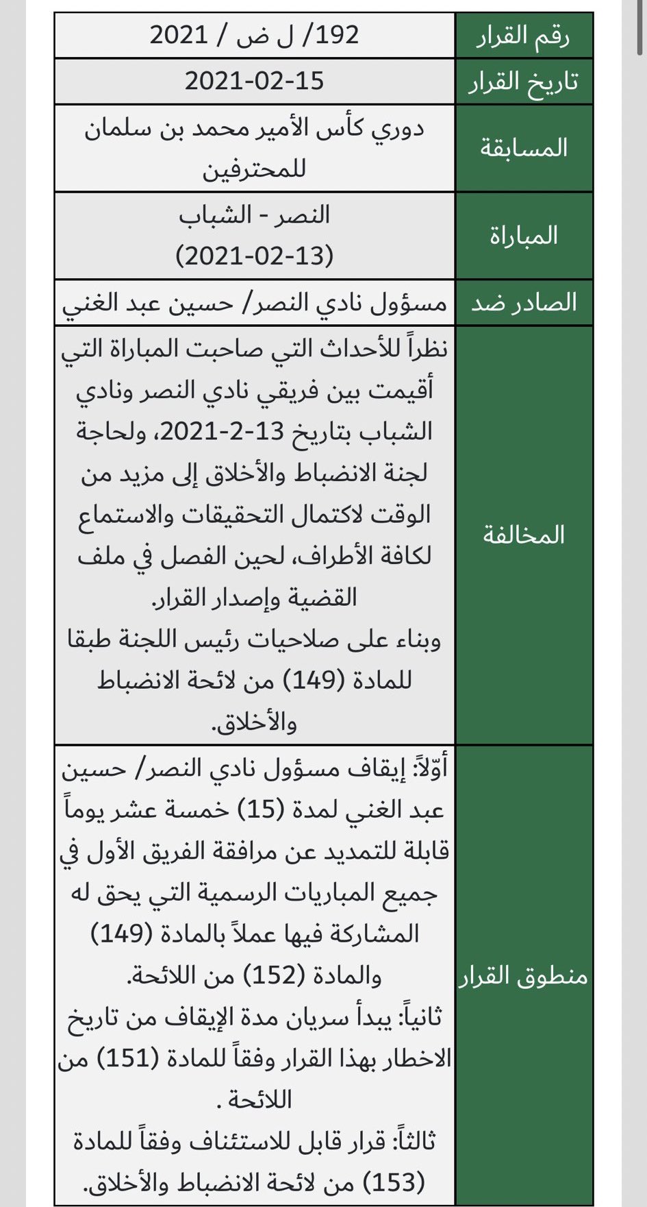 كما قررت حرمان خالد البلطان رئيس الشباب من دخول الملاعب أثناء وقت المباريات لـ 15 يوما، طبقا للمادتين 149 و152 من اللائحة، لحين إكمال التحقيقات والاستماع للأطراف.
