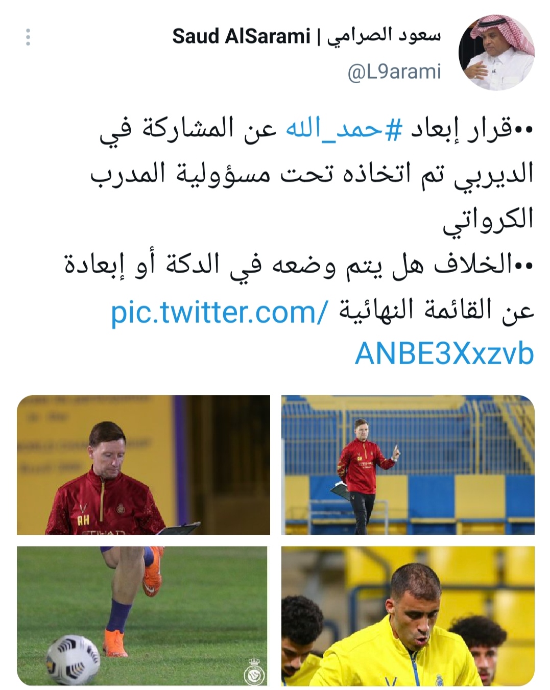 وأكد الصرامي عبر حسابه الرسمي بموقع التواصل الاجتماعي “تويتر” أن الكرواتي آلين هورفات قرر إستبعاد المغربي عبد الرزاق حمد الله عن المشاركة في الديربي أمام الهلال، نظرًا لانخفاض مستواه وغيابه عن التسجيل”.