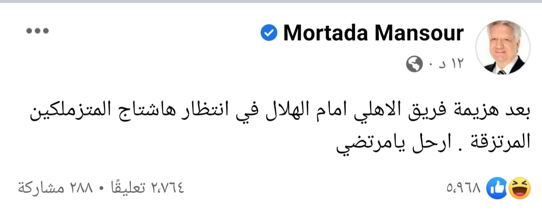 وكتب مرتضى منصور عبر حسابه الرسمي بموقع التواصل الاجتماعي “فيس بوك”: “بعد هزيمة فريق الأهلي أمام الهلال في انتظار هاشتاج المتزملكين المرتزقة “ارحل يامرتضى”.