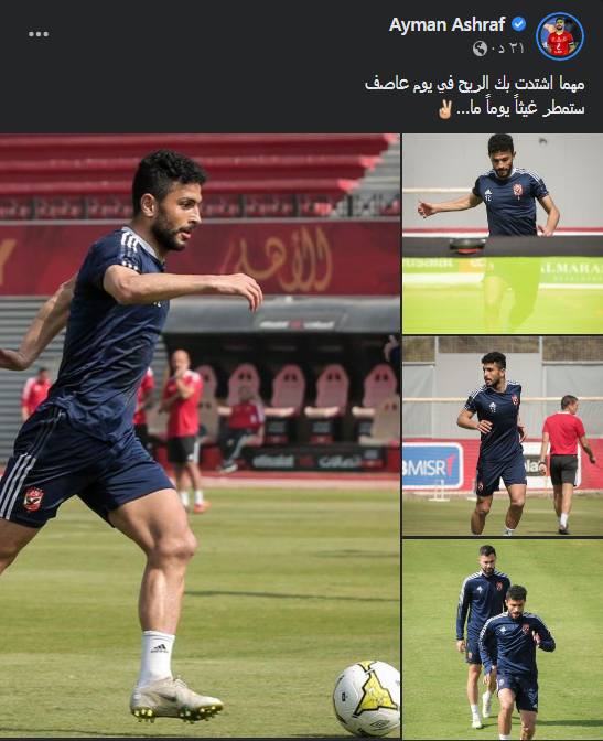 وكتب أيمن أشرف عبر صفحته الرسمية في موقع التواصل الاجتماعي والتغريدات القصيرة «تويتر»: “مهما اشتدت بك الريح في يوم عاصف.. ستمطر غيثًا يومًا ما”.