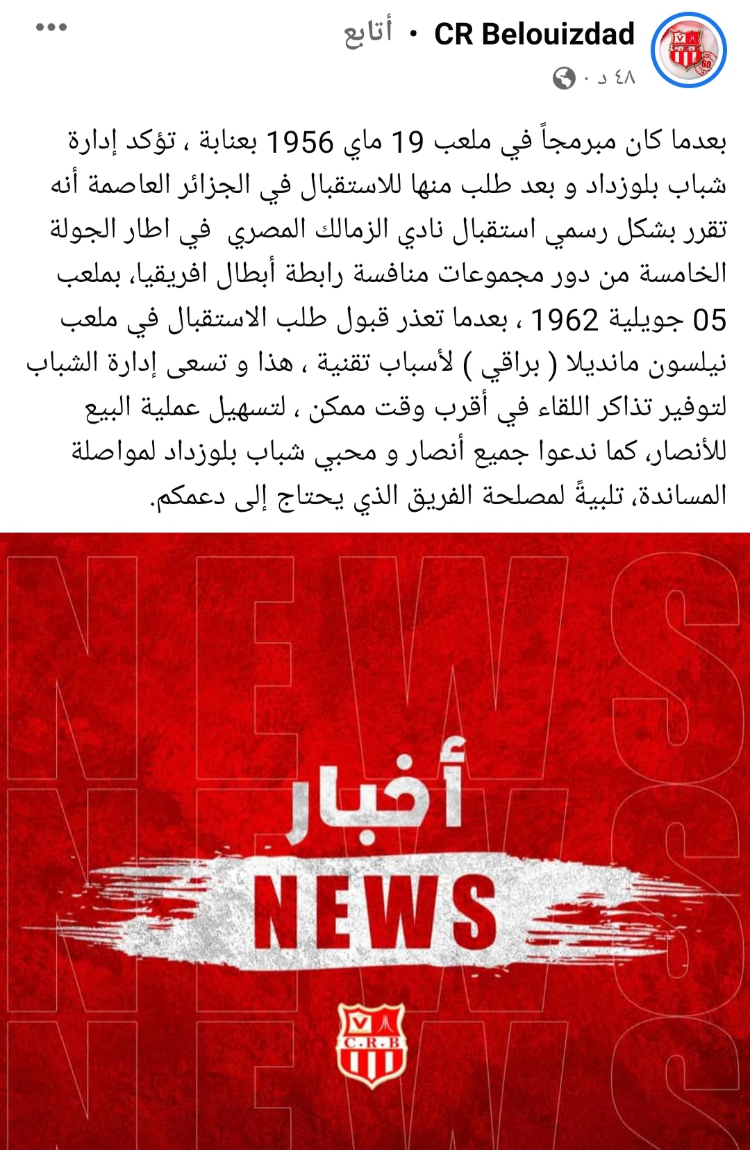 وأضاف: “تقرر بشكل رسمي استقبال نادي الزمالك المصري في اطار الجولة الخامسة من دور مجموعات منافسة رابطة أبطال افريقيا، بملعب 05 جويلية 1962.