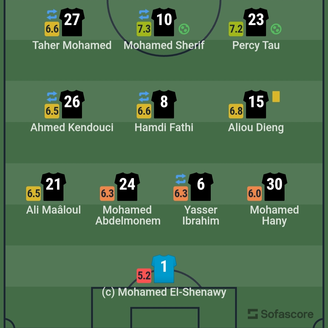 وحصل باقي اللاعبين على تقييم مخيب، حيث كان محمد الشناوي هو الأسوأ في المباراة بـ5.2، يليه خط الدفاع محمد هاني وياسر إبراهيم ومحمد عبدالمنعم، فيما جاء تقييم علي معلول 6.5.