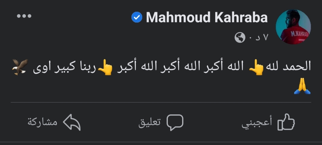 وكتب محمود كهربا، عبر حسابه الرسمي على موقع التواصل الاجتماعي “فيس بوك”:” ‏الحمد لله.. الله أكبر الله أكبر الله أكبر ..ربنا كبير اوى”