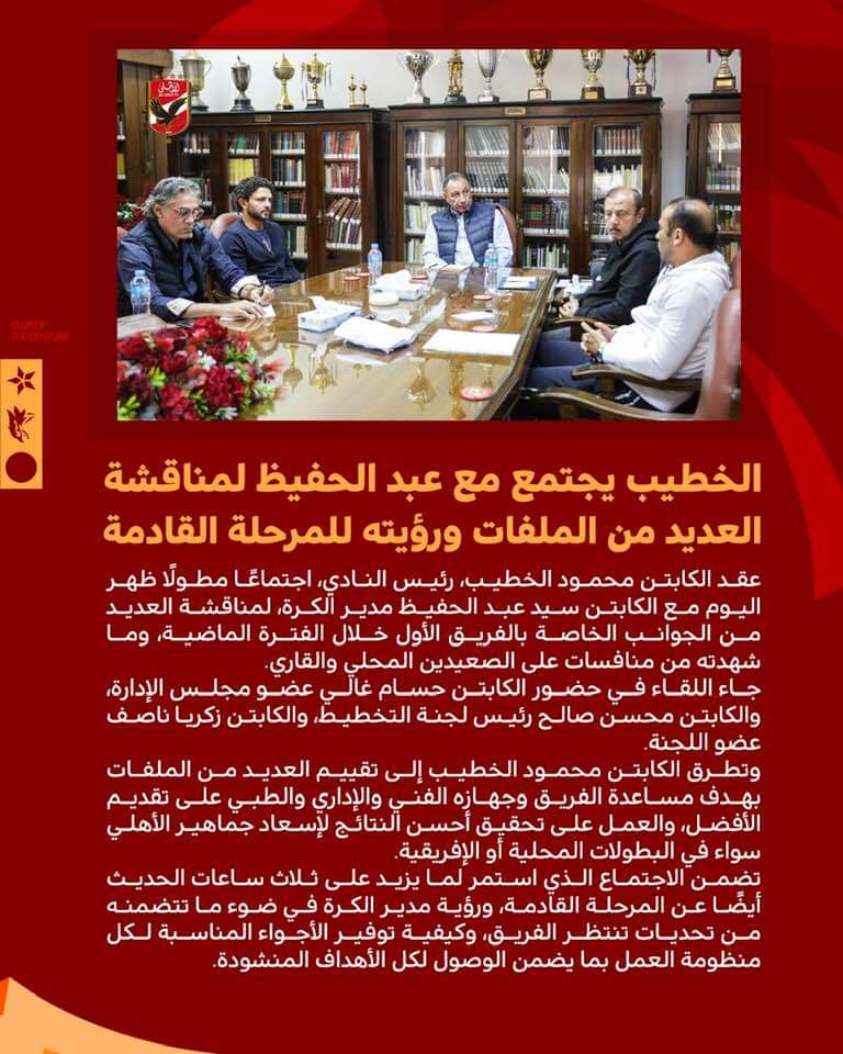 وتطرق الخطيب إلى تقييم العديد من الملفات بهدف تحقيق أفضل النتائج ومساعدة الفريق وجهازه الفني والإداري والطبي على تقديم الأفضل، لحصد البطولات المحلية والأفريقية لإسعاد الجماهير.