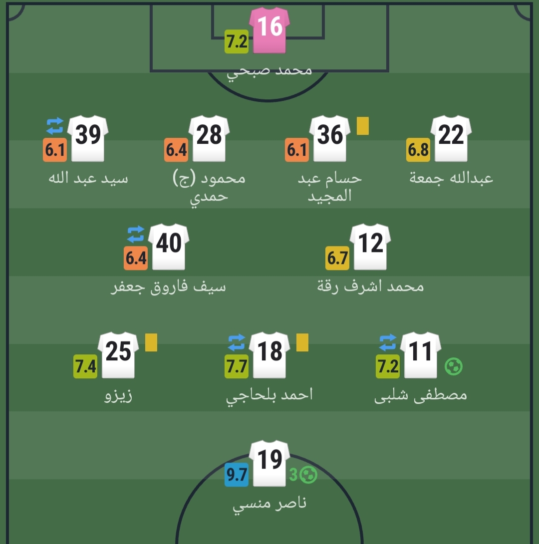 وحصل ناصر منسي، على أعلى تقييم في المباراة بقيمة 9.7 درجة، ويليه أحمد بلحاج كثاني أفضل لاعب في المباراة بتقييم 7.7.
