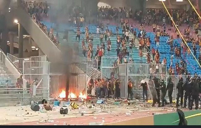 ودخلت جماهير الترجي في اشتباكات قوية مع الأمن، لتقوم بإلقاء الشماريخ الأمر الذي تسبب في اشتعال النيران في الناحية اليمني من الملعب، ليقرر الحكم تأخير انطلاق الشوط الثاني.