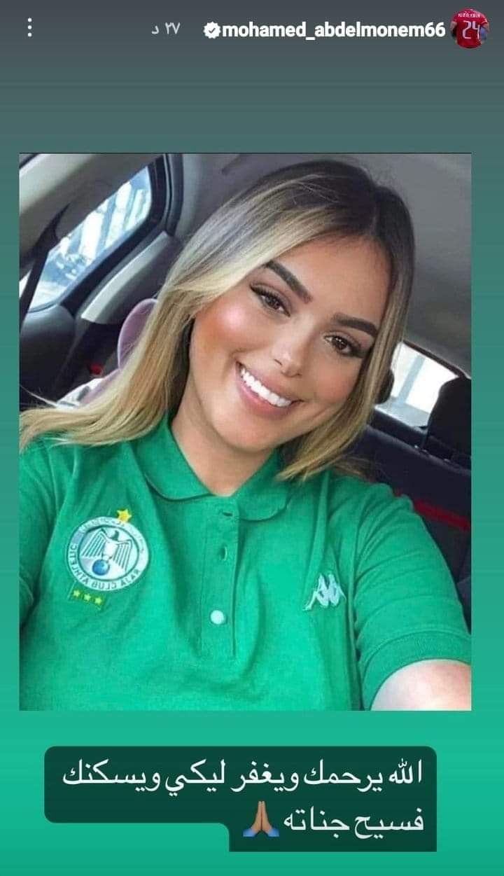ونشر عبد المنعم صورة للمشجعة المغربية عبر حسابه الرسمي على موقع التواصل الإجتماعي “إنستجرا” معلقاً عليها :” الله يرحمك ويغفر ليكي ويسكنك فسيح جناته”.