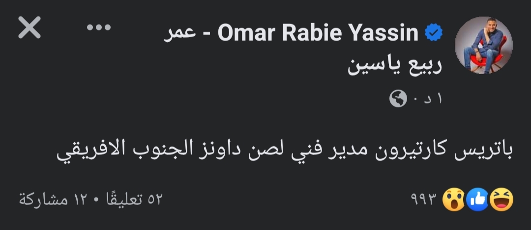 وكتب عمر ربيع ياسين عبر حسابه الرسمي على موقع التواصل الاجتماعي “فيس بوك”:” باتريس كارتيرون مدير فني لصن داونز الجنوب أفريقي”.