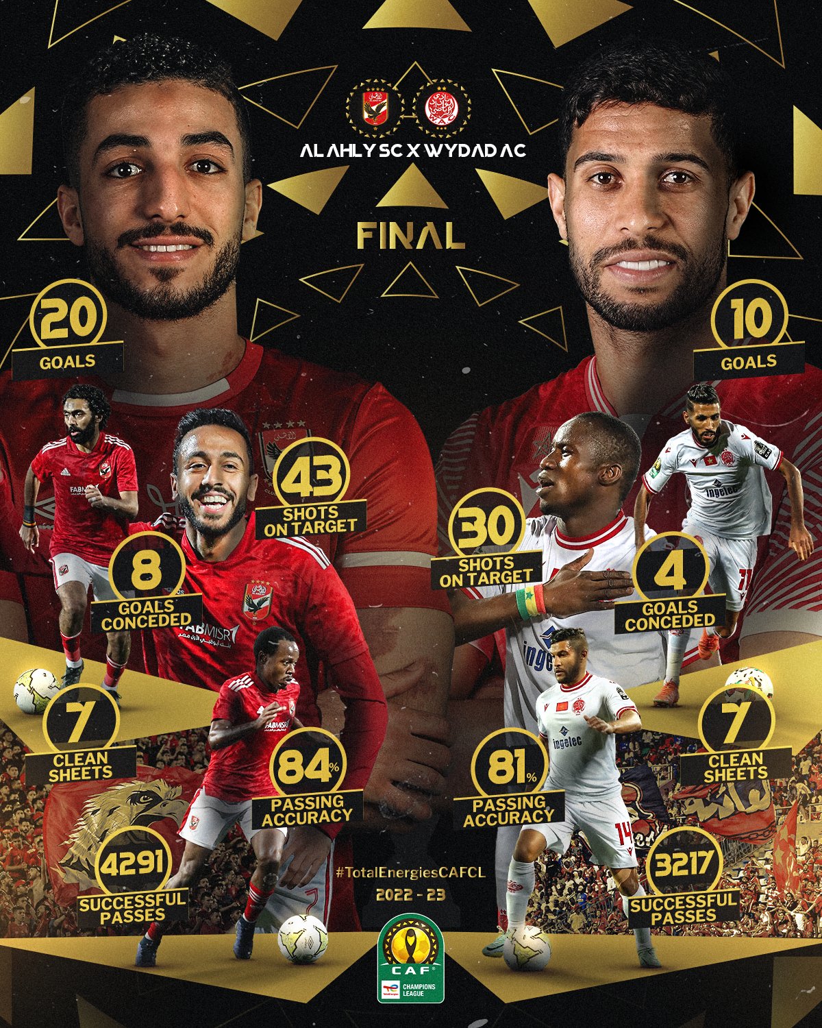 – سجل الأهلي 20 هدفًا قبل مواجهة النهائي، فيما سجل الوداد المغربي 10 أهداف فقط.