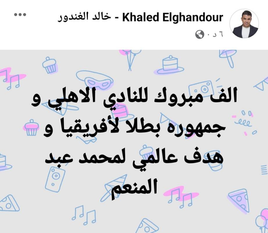 وكتب الغندور عبر حسابه الخاص بموقع التواصل الاجتماعي “فيس بوك”: “الف مبروك للنادي الأهلي، وجمهوره بطلا لأفريقيا و هدف عالمي لمحمد عبد المنعم”.